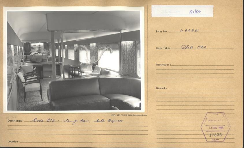 | Keywords: archives state records nsw staterecordsnsw newsouthwales blackandwhite rail railway indoor black and white Title: Interior of railway carriage showing lounge car on the 'Melbourne Express' Dated: February 1962 Digital ID: 17420_a014_a014000882 Series: NRS 17420 State Rail Authority Archives Photographic Reference Print Collection Rights: No known copyright restrictions www.records.nsw.gov.au/about-us/rights-and-permissions We'd love to hear from you if you use our photos/documents. Many other photos in our collection are available to view and browse on our website using Photo Investigator. Title: Interior of railway carriage showing lounge car on the 'Melbourne Express' Dated: February 1962 Digital ID: 17420_a014_a014000882 Series: NRS 17420 State Rail Authority Archives Photographic Reference Print Collection Rights: No known copyright restrictions www.records.nsw.gov.au/about-us/rights-and-permissions We'd love to hear from you if you use our photos/documents. Many other photos in our collection are available to view and browse on our website using Photo Investigator. |