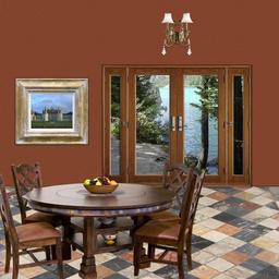 Keywords: interior room home house space environment place dining table chairs double door photograph frame slate floor flooring wall wallpaper design indoors backdrop structure decorative