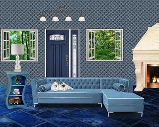 Keywords: interior room living home house blue door windows sofa cats table lamp fireplace light fixture design floor