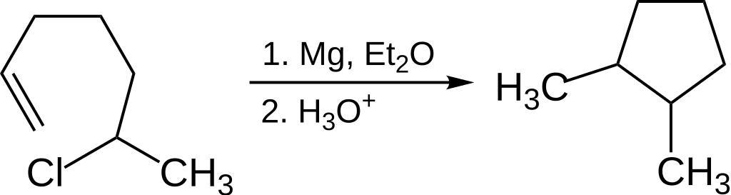 | Keywords: Intermolecular Grignard’s alkene addition.svg en An example of intramolecular addition of Grignard's reagent to double Carbon-Carbon bond transformation 6-chlorohept-1-ene to 1 2-dimethylcyclopentane uk П иклад внут ішньомолекуля ного п иєднання еактивів Г ынья а по неактивованому подвійному зв'язку пе етво ення 6-хло огепт-1-ену на 1 2-диметилциклопентан de Beispiel einer intramolekularen Addition einer Grignard-Reagenz an eine Kohlenstoff-Doppelbindung Umlagerung von 6-Chlorhept-1-en zu 1 2-Dimethylcyclopentan Intermolecular Grignard s alkene addition gif 2015-01-22 Kopiersperre other fields c 1 + PD-own PD-chem Organometallic compounds Organic reactions Grignard reagents |