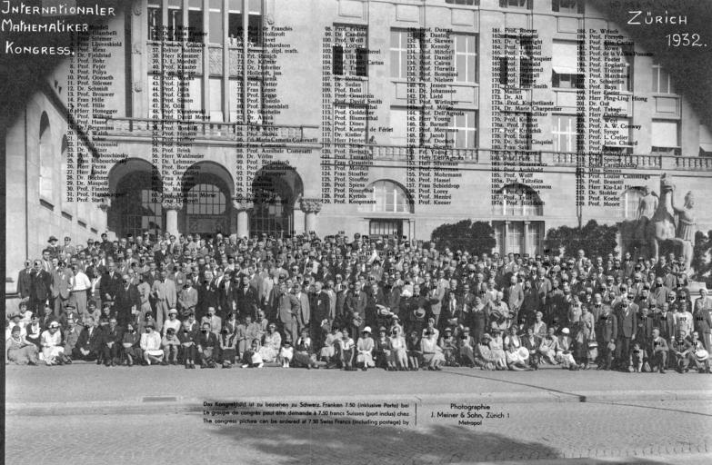 | Keywords: Internationaler Mathematikerkongress Zürich 1932 - ETH BIB Portr 10680-C-FL (Johannes Meiner).jpg depicted people de Teilnehmer am Internationalen Mathematikerkongress in Zürich 1932 mit Angehörigen depicted place Universität Zürich Westeingang University of Zurich west entrance Université de Zurich entrée ouest 1932 photo bw paper Querformat Spezialmass Institution ETH-Bibliothek Bildarchiv object history exhibition history credit line accession number Portr_10680-C-FL http //doi org/10 3932/ethz-a-000102706 e-pics Bildarchiv online ETH Bibliothek PD-old-auto-1996 1941 CH <gallery> File Internationaler Mathematikerkongress Zürich 1932 - ETH BIB Portr_10680-FL Johannes Meiner jpg </gallery> Position topleft Internationaler Mathematiker Kongress Position topright Zürich 1932 top font-style italic 0 1 Frl Mordell 33 Prof Wiener 66 Prof de Franchis 0 98 Prof Fekete 130 Prof Dumas 161 Prof Roever 188 Dr Wrinch - 0 2 Prof Giambelli 34 Dr Anna Fischer 67 Prof Hollcroft 0 99 Dr Candido 131 Dr Dantzig 162 Frau Tricomi 189 Prof Forsyth - 0 3 Frau Störmer 35 Prof Favard 68 Prof Juvet 100 Prof Weiß 132 Prof Skewes 163 Dr Cartwright 190 Prof Elie Cartan - 0 4 Frau Lövenskiold 36 Prof N Criticos 69 Prof Richardson 101 Dr Locher 133 Frl Kenedy 164 Prof Turnbull 191 Prof Rowe - 0 5 Prof Riesz 37 Rektor Buchner 70 Brunner dipl math 102 Rektor Plaucherel 134 Prof Mitchell 165 Prof Tortorici 192 Prof de la Vallée Poussin - 0 6 Dr Fjeldstad 38 Herr Kemmer 71 Frl Rainich 103 Dr Ullrich 135 Prof Daniell 166 Prof Du Pasquier 193 Prof Fueter - 0 7 Prof Bohr 39 D L Mordell 72 Dr Kálmár 104 Prof Henri Cartan 136 Prof Cairns 167 Prof Berwald 194 Prof Togliatti - 0 8 Prof Fejér 40 Prof Knaster 73 Dr Hofreiter 105 Prof Tiercy 137 Prof Hurwitz 168 Prof Reymond 195 Prof Tricomi - 0 9 Prof Pólya 41 Frau Wiener 74 Hollcroft jun 106 Herr Büsser 138 Prof Bompiani 169 Prof Steggall 196 Prof Marchand - 10 Prof Gonseth 42 Prof Weeks 75 Prof JarnÃk 107 Dr Rellich 139 Prof Nielsen 170 Prof Picone 197 Dr Schaertlin - 11 Prof Störmer 43 Prof Janet 76 Prof Vetter 108 Dr Sudan 140 Dr Jessen 171 Prof Paul Smith 198 Prof Bays - 12 Dr Schmidt 44 Prof Julia 77 Frau Lense 109 Prof Buhl 141 Dr Johansson 172 Maillet 199 Herr Fueter - 13 Prof Brouwer 45 Prof Cèch 78 Prof Lense 110 Prof Graustein 142 Dr Liebl 173 Dr Alt 200 Herr Ping-Ling Hiong - 14 Frau Hille 46 Prof Simon 79 Prof Tonolo 111 Prof David Smith 143 Prof Wirtinger 173a Prof Kogbetliantz 201 Dr Gut - 15 Prof Hille 47 Dr Gölz 80 Prof Rosenblatt 112 Frau Blumenthal 143a Prof Müller 174 Dr Marie Charpentier 202 Prof Takagi - 16 Herr Honegger 48 Prof Kuratowski 81 Dr Staehelin 113 Prof Goldziher 144 Prof Dell ™Agnola 175 Dr K Dändliker 203 Herr Guldberg - 17 Prof Wilkosz 49 Prof David Morse 82 Dr Amirà 114 Prof Blumenthal 145 Herr Young 176 Prof Kollros 204 Prof Weyl - 18 Prof Hasse 50 Herr Feinler 83 Prof Dive 115 Prof Dines 146 Dr Barnett 176a Prof Franel 205 Prof A W Conway - 19 Dr Bergmann 51 Prof Tonelli 84 Prof Wavre 116 Prof Kampé de Fériet 147 Prof Merriman 177 Prof Kraitchik 206 Prof Synge - 20 Prof Walsh 52 Prof Husson 85 Prof Scorza 117 Dr Kistler 148 Dr Jacob 178 Prof Szász 207 Prof L Crelier - 21 Prof Schur 53 Prof Heffter 86 Frl Maria Camelia Comesatti 118 Herr Herter 149 Prof Doetsch 179 Dr Silvio Cinquini 208 Prof Jules Chuard - 22 Prof Vincensini 54 Prof Severi 87 Frau Comesatti 119 Prof Stone 150 Frau Skewes 180 Frau Saks 209 Prof Adams - 23 Dr Politzer 55 Prof Brink 88 Prof Annibale Comesatti 120 Prof Bernays 151 Frl Young 181 Dr Pollaczek 210 Prof Schieldrop - 24 Prof Riabouchinsky 56 Herr Waldmeier 89 Dr Völlm 121 Prof Tamarkin 152 Herr Dell ™Agnola 182 Prof Fehr 211 Prof Speiser - 25 Frau Riabouchinsky 57 Dr Lehmann 90 Prof Bieberbach 122 Frau Graustein 153 Herr Silvermann 183 Prof Straszewicz 212 Prof Carathéodory - 26 Herr Perna 58 Prof Bortolotti 91 Prof Tschebotaröw 123 Prof Mordell 154 Prof Silvermann 184 Prof Archibald 213 Miss Simons - 27 Herr Linder 59 Dr Ganguillet 92 Prof Fantappié 124 Frau Stouffer 155 Prof Mohrmann 185 Prof Wolff 214 Prof Louise Cummings - 28 Dr Bochner 60 Frau Adams 93 Dr Züllig 125 Prof Stouffer 156 Prof Hamel 185a Prof Tzitzéica 215 Prof Brusotti - 29 Dr Maspoli 61 Prof Ahlfors 94 Lietzmann 126 Prof Spiess 157 Frau Schieldrop 186 Prof Papaïoannou 216 Herr Kiu-Lai Hiong - 30 Prof Finsler 62 Dr Mahler 95 Herr Trost 127 Prof Rosenthal 158 Prof Lorey 186a Prof Kiepert 217 Dr Stohler - 31 Prof Harshbarger 63 Prof Marston Morse 96 Prof Snyder 128 Prof Kyrtsis 159 Prof Mentré 187 Prof Tyler 218 Prof Koebe - 32 Prof Stark 65 Frau Hollcroft 97 Prof Hadamard 129 Prof Koopmann 160 Prof Kueser 187a Prof Blichfeldt 219 Prof Moore bottom font-style italic Das Kongreßbild ist zu beziehen zu Schweiz Franken 7 50 inklusive Porto bei 3 <math> \Biggr\ </math> text-align center Photographie - Le groupe de congrès peut être demande à 7 50 francs Suisses port inclus chez text-align center J Meiner Sohn Zürich 1 - The congress picture can be ordered at 7 50 Swiss Francs including postage by text-align center Metropol International Congress of Mathematicians 1932 Photographs by Johannes Meiner Bildarchiv der ETH-Bibliothek Zürich Group photographs of standing people Group photographs of scientists Black and white photographs of groups University of Zurich Hauptgebäude |