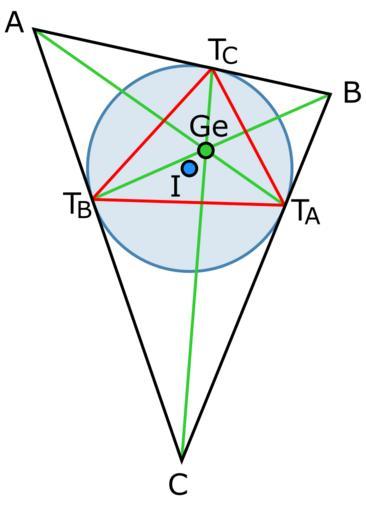 Keywords: Intouch Triangle and Gergonne Point.svg Diagram to shown the construction of the intouch or contact triangle red and the Gergonne Point green of a triangle black The blue circle is the incircle and the blue point I is the incentre of the original triangle Self-Made using Inkscape 08/05/2007 Inductiveload Incircles of triangles Joseph Diez Gergonne |