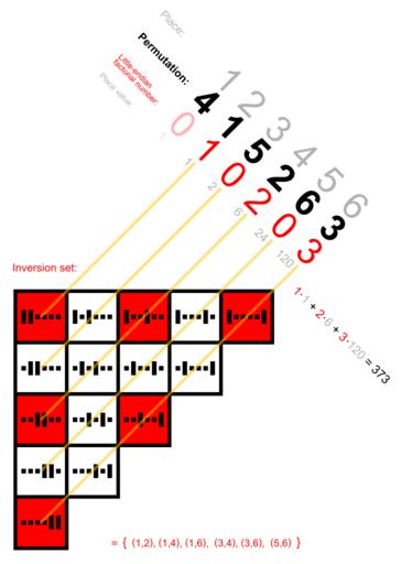 Keywords: Inversion set and vector of a permutation.svg Example of inversions of a permutation The example permutation 4 1 5 2 6 3 has the inversion vector <font color red> 0 1 0 2 0 3 </font><br> and the inversion set <font color red> 1 2 1 4 3 4 1 6 3 6 5 6 </font> <br> The inversion vector reflected factorial number converted to decimal is 373 This permutation is also shown in this array Also the number 373 is found there The inversion set contains 6 of the <math>\tbinom 6 2 </math> 15 2-subsets of a 6-set <br> The triangle is ordered like the square array A018900 compare this triangle Wolfram Alpha shows the inversion vector ã ˆ1 2 3 0 0ã ‰ for this permutation http //www wolframalpha com/input/ i permutation 1 4 2 3 5 6 <br> ã ˆ3 0 2 0 1ã ‰ is shown for its inverse http //www wolframalpha com/input/ i permutation 1 2 4 3 6 5 own Watchduck Inversion set of a 6-element permutation Little-endian factorial numbers Unassessed QI candidates |