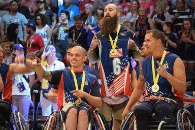 | Keywords: Invictus Games 2016, Wheelchair Basketball 160512-N-WW503-615.jpg en Navy wounded warriors Fire Controlman 3rd Class ret Jason Reyes Electrician's Mate Apprentice ret Steven Davis and Chief Yeoman ret Javier D Rodriguez Santiago pose after winning the gold medal in wheelchair basketball May 12 2016 in Orlando Fla The Invictus Games is an international adaptive sports competition for wounded ill and injured Service members and veterans U S Navy photo by Lt j g Marissa A Cruz/Released <br>Unit Commander Navy Installations Command 2016-05-12 Lt j g Marissa Cruz https //www dvidshub net/image/2600692/invictus-games-2016-wheelchair-basketball 160512-N-WW503-615 2016-05-19 19 28 FL US PD-USGov-Military-Navy 2016 Invictus Games Images from DoD uploaded by Fæ |
