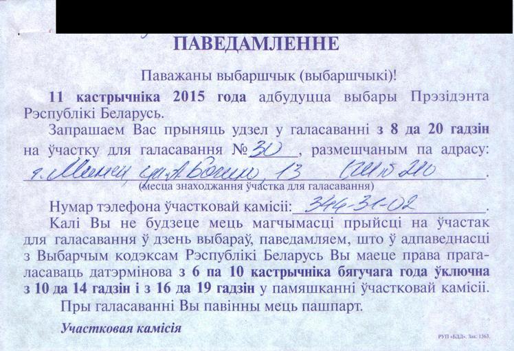 | Keywords: Invitation to presidential election in Belarus (2015) - reverse.jpg en Official invitation to presidental elections in Belarus 2015 delivered by post reverse Private information is painted in black Translation from Belarusian Notification Dear voter voters On 11th October 2015 election of the president of the Republic of Belarus will take place We invite you to take part in the voting from 8 to 20 in the polling station No 30 which is situated at Minsk A Bačyly street 13 School No 210 address of the polling station Phone number of the local voting commission 344-31-02 If you can't vote on the polling day we inform that according to the Voting Codex of the Republic of Belarus you have a right to vote preliminary from 6th to 10th October of this year including the last day from 10 to 14 and from 16 to 19 in the local voting commission's premises You should have a passport during the voting Local voting commission be Афіцыйнае зап ашэнне на п эзідэнцкія выба ы ў Бела усі 2015 Зва отны бок Тэкст Паведамленне Паважаны выба шчык выба шчыкі 11 каст ычніка 2015 года адбудуцца выба ы П эзідэнта Рэспублікі Бела усь Зап ашаем Вас п ыняць удзел у галасаванні з 8 да 20 гадзін на ўчастку для галасавання 30 азмешчаным па ад асу г інск ул А Бачылы 13 СШ 210 месца знаходжання ўчастка для галасавання ума тэлефона ўчастковай камісіі 344-31-02 Калі Вы не будзеце мець магчымасці п ыйсці на ўчастак для галасавання ў дзень выба аў паведамляем што ў адпаведнасці з Выба чым кодэксам Рэспублікі Бела усь Вы маеце п ава п агаласаваць датэ мінова з 6 па 10 каст ычніка бягучага года ўключна з 10 да 14 гадзін і з 16 да 19 гадзін у памяшканні ўчастковай камісіі П ы галасаванні Вы павінны мець пашпа т Участковая камісія ru Официальное п иглашение на п езидентские выбо ы в Бела уси 2015 Об атная сто она Текст Уведомление Уважаемый изби атель изби атели 11 октяб я 2015 года п ойдут выбо ы п езидента Республики Бела усь П иглашаем Вас п инять участие в голосовании с 8 до 20 часов на участке для голосования 30 азмещённом по ад есу г инск ул А Бачило 13 СШ 210 местонахождение участка для голосования оме телефона изби ательной комиссии 344-31-02 Если Вы не будете иметь возможности п ийти на участок для голосования в день выбо ов уведомляем что в соответствии с Изби ательным Кодексом Республики Бела усь Вы имеете п аво п оголосовать дос очно с 6 по 10 октяб я текущего года включительно с 10 до 14 часов и с 16 до 19 часов в помещении изби ательной комиссии П и голосовании Вы должны иметь паспо т Участковая комиссия 2015-10-01 22 30 32 PD-textlogo PD-BY-exempt Homoatrox other versions 100px cc-by-sa-4 0 Uploaded with UploadWizard Voter invitation cards Presidential election of Belarus 2015 Cyrillic writing |