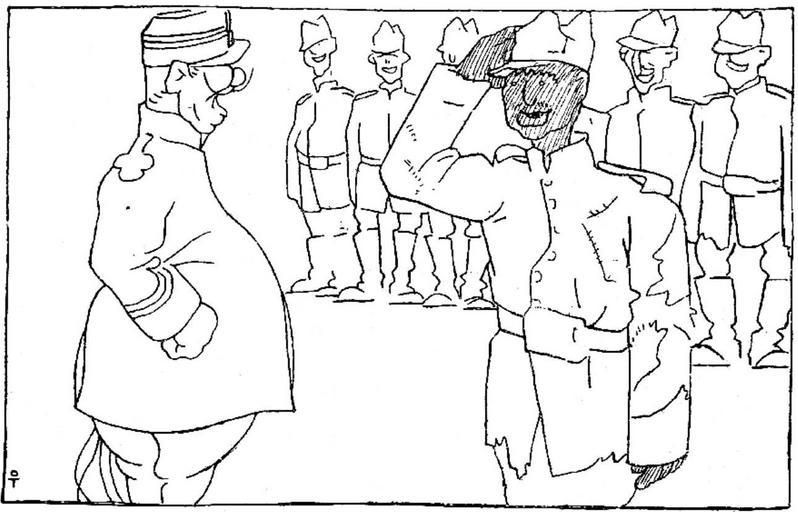 | Keywords: Ion Theodorescu-Sion - Inspecţia generalului, Furnica, 1 apr 1910.JPG en Inspecţia generalului The General's Inspection cartoon and wine advertisement in the Romanian satirical sheet Furnica A dark-faced and tattered Gypsy recruit is questioned by a Romanian general <br>I'ascultă mă ţigane cine-i comandantul regimentului Yo Gypsy listen here who is the regimental commander <br>Don colonel să trăiţi Yessir the Colonel sir <br>Mai superior decât colonelul cunoşti vr'un grad Do you know of any rank that would be more superior than the Colonel sic <br>Mai superior decât colonelul e don ghinărar More superior than the Colonel that would be the Ge'eral <br>Şi mai superior decât generalul cine-i mă cioară And more superior than the General who would that be darkie <br>Vinul Ştirbey C'aşà am auzit pe don sulocotenent că'i spunea lui don locotenent când îi face cinste la cantină că vinul Ştirbey e hăl mai superior dă pă pământ Ştirbey Wine 'Least that's what ah's heard the Sec'nd Lieutenant telling the Lieutenant when he wuz buyin' him drinks 'n the mess Ştirbey Wine there ain't none more superior on earth Furnica 30/1910 available through the Bucharest City Library http //digitool dc bmms ro 8881/R/3YEN91RDQHN2LLAT98CMIIVH6GP3F19S45D2I6YYIM6AN3KQEN-00734 func search DacoRomanica archive Creator Ion Theodorescu-Sion 1910-04-01 Caricatures by Ion Theodorescu-Sion Furnica magazine 1910 cartoons 1910 in Romania Military history of Romania Caricatures of soldiers 1910 in military history Romanian Roma people in art Racism in Romania Wines of Romania Advertisements in the Kingdom of Romania 1910 advertisements PD-old-auto 1939 |
