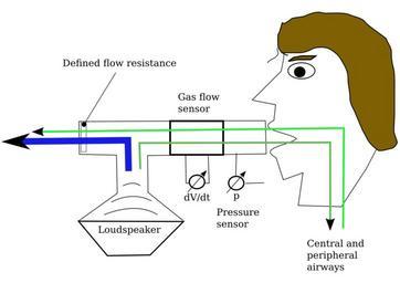 | Keywords: IOS Head.svg en The picture shows an apparatus for measuring the human airway resistance The patient breathes normally through a tube and a defined flow resistance e g a metal grid During normal breathing the loudspeaker creates a pressure pulse which propagates partly into the patient's lungs The gas flow sensor and the pressure sensor measure the evolution of pressure and flow over time Own Mwiehl2 2008-08-15 Pulmonology | ||||