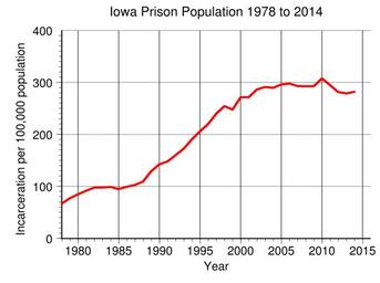 | Keywords: Iowa Prison Population.svg en Iowa prison incarceration rate per 100 000 population from 1978 to 2014 Data from http //www bjs gov/index cfm ty nps BJS 2016-05-11 own Delphi234 other versions current annually Generated with Wikimedia SVG Chart SVG Chart/box cc-zero Prisons in Iowa Imprisonment and detention rates in the United States |