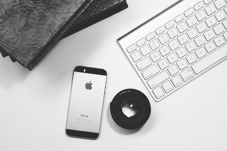 Keywords: iphone smartphone mobile technology keyboard business creative office desk lens black and white notebooks