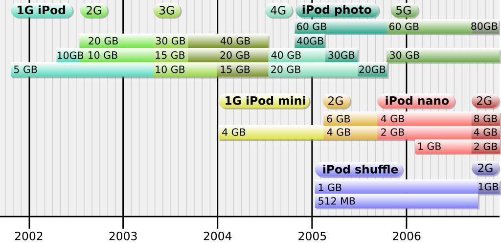 | Keywords: IPod Models Timeline.svg Timeline of iPod models Created by User IE using Inkscape 0 44 Based on original image by User Grm_wnr on Wikimedia Commons References used Original timeline image created by User Grm_wnr available at en Template Timeline of iPod models en Mactracker software version 4 0 5 as of 18 November 2006 available from http //www mactracker ca/ mactracker ca It contains a database of every Mac and iPod model Various pages from http //www apple com/pr/library/ Apple's press release library accessed on 18 November 2006 en wikipedia 2006-09-12 IE wikipedia en original upload log page en wikipedia IPod_Models_Timeline svg 2006-09-18 12 08 IE 700×340×0 52433 bytes <nowiki>Created by User IE as before Labelled October 2006 shuffle as 2G Also made background colour white with no transparency - therefore no layers in SVG Raster image is no longer transparent - to fix Firefox printing bug </nowiki> 2006-09-12 19 35 IE 703×341×0 53352 bytes <nowiki>Timeline of iPod models Created by User IE using Inkscape 0 44 Based on original image by User Grm_wnr on Wikimedia Commons </nowiki> Product timelines IPod charts SVG portable electronics |
