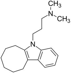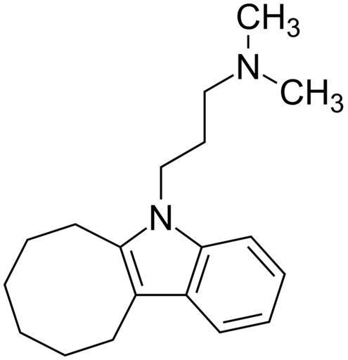 | Keywords: Iprindole 200.svg validSVG Structure of 3- 6 7 8 9 10 11-hexahydro-5H-cyclooctabindol-5-yl -N N-dimethylpropan-1-amine Own 2014-05-21 Emeldir <span class signature-talk ></span> Chemical structure verified https //upload wikimedia org/wikipedia/commons/1/1e/Iprindole_200 svg 1S/C19H28N2/c1-20 2 14-9-15-21-18-12-6-4-3-5-10-16 18 17-11-7-8-13-19 17 21/h7-8 11 13H 3-6 9-10 12 14-15H2 1-2H3 PLIGPBGDXASWPX-UHFFFAOYSA-N 5560-72-5 Synonyms <small><nowiki>1- 3-Dimethylaminopropyl -2 3-hexamethyleneindole 5- 3-Dimethylaminopropyl -6 7 8 9 10 11-hexahydrocyclo-octbindole hydrochloride 5-3- Dimethylamino propyl-6 7 8 9 10 11-hexahydro-5H-cyclooctbindole 5-3- Dimethylamino propyl-6 7 8 9 10 11-hexahydro-5H-cyclooctbindole 5-3- Dimethylamino propyl-6 7 8 9 10 11-hexahydro-5H-cyclooctbindole hydrochloride 5H-Cyclooctbindole 5-3- dimethylamino propyl-6 7 8 9 10 11-hexahydro- 8CI 5H-Cyclooctbindole 6 7 8 9 10 11-hexahydro-5- 3-dimethylaminopropyl - 5H-Cyclooctbindole-5-propanamine 6 7 8 9 10 11 hexahydro-N N-dimethyl- 5H-Cyclooctbindole-5-propanamine 6 7 8 9 10 11-hexahydro-N N-dimethyl- 9CI BRN 1386299 Galatur Iprindol hidrocloruro de Iprindole Iprindole chloride Iprindole Hydrochloride Iprindole USAN Iprindolum NSC 169449 Pramindole pramindole Pramindole Hydrochloride Prondol Tertran WLN T B658 HN TJ H3N1 1 WLN T C658 BN TJ B3N1 1 Wy-3263 WY-3263 Wy-3263 iprindole Wy-3263 VAN </nowiki></small> PD-chem Tricyclic antidepressants Cyclooctane derivatives Indoles Tertiary amines |