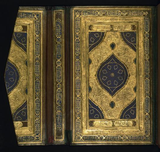 | Keywords: Iranian - Binding from Five Poems (Quintet) - Walters W610binding - Bottom Interior Open.jpg This dark brown leather binding with a flap is original to the manuscript Walters W 610 It has central ovals and pendants all brushed with gold and dentelle-style doublures with filigree work decorated central ovals pendants and cornerpieces in blue and gold century 16 AD Safavid dark brown leather with gold Folio cm 32 5 20 accession number W 610 binding 83617 Henry Walters Baltimore date and mode of acquisition unknown Walters Art Museum Henry Walters Acquired by Henry Walters place of origin Iran Walters Art Museum license 3D Islamic bookbindings in the Walters Art Museum Khamsa of Nizami Safavid Walters MS 610 Art of Iran Media contributed by the Walters Art Museum needs category review |