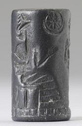 Keywords: Iranian - Cylinder Seal - Walters 42775 - Side D.jpg Walters Art Museum artwork Seated King Man + Inscription <br> Incorrect-Two uses of 42775 Although the Achaemenids used stamp seals for private documents cylinder seals continued to be used for official royal business This seal depicts the king fighting a lion-griffin in two scenes First he engages in close combat with the lion-griffin Second the king standing on a reclining sphinx aims his bow at the mythical beast also standing on a sphinx Between them is the benign god Ahura Mazda in an oval cartouche with a winged disk above between 550 330 BC Achaemenid chalcedony cm 2 8 1 4 accession number 42 775 38841 Sadie Jones Mrs Henry Walters New York date and mode of acquisition unknown Sale Joseph Brummer New York 1941 Walters Art Museum 1941 by purchase Museum purchase 1941 Ancient Persia The Art of an Empire The Walters Art Gallery Baltimore; University Art Museum University of Texas at Austin Austin 1978 place of origin Iran Walters Art Museum license Cylinder seals in the Walters Art Museum Art of Iran Iranian Seated-King Figure and Inscription Walters 42775-No 1 Cuneiform on cylinder seals Walters Art Museum cylinder seals with cuneiform Media contributed by the Walters Art Museum needs category review