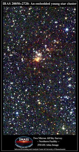 Keywords: IRAS 20050+2720 (2MASS).jpg The embedded young star cluster IRAS 20050+2720 the bright agglomeration of stars near the center of the 2MASS three-color image This cluster has been recently studied by Chen et al 1997 ApJ 475 163 The cluster appears to consist of several subclusterings three of which were studied by Chen et al ; there appear to be several other subclusterings not included in their near-IR imaging The IRAS source itself is the brightest reddest southern subclustering Subcluster A Some reflection nebulosity is associated with the cluster stars Chen et al find an extinction to the cluster of AV ~ 10 although the extinction is clearly higher for subcluster A It is also clear from the 2MASS image that significant extinction is distributed throughout this field More than half of the point sources in the cluster appear to show an infrared excess beyond this extinction indicating that we may be seeing thermal dust emission from circumstellar disks around classical T Tauri stars These sources are therefore likely pre-main sequence objects Chen et al find that the slope and turnover of the K-band luminosity function imply an overall age for this cluster of ~1 Myr although the subclusters are of somewhat different ages The IRAS source subcluster A is also associated with dense molecular gas as traced by millimeter radio observations and coincides with the center of a multipolar outflow with a dynamical age of only 10<sup>3</sup> to 10<sup>4</sup> yr http //www ipac caltech edu/2mass/gallery/images_iras html 2MASS Atlas Image Gallery Various IRAS Sources Two Micron All Sky Survey 2MASS a joint project of the University of Massachusetts and the Infrared Processing and Analysis Center/California Institute of Technology funded by the National Aeronautics and Space Administration and the National Science Foundation 2MASS Atlas image 2MASS IRAS images |