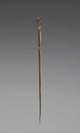 | Keywords: Irish Celtic - Pin with Spiral Head - Walters 542340.jpg  This elegantly tapering bronze pin has an unusual finial made by dividing the stem at the head and curving one stem backward into a spiral Spiral-headed pins with two outward curling spirals have been found in Ireland and in 7th- and 8th-century Anglo-Saxon sites This example was found at Armagh Northern Ireland in 1886 Armagh was an important royal site from pre-historic times into the Christian era and from the mid-5th century AD onwards the See of Saint Patrick Ireland's patron saint century 6 8 Early Medieval bronze cm 22 7 1 2 0 6 accession number 54 2340 699 Found in Armagh Northern Ireland 1886 Robert Day Cork Ireland date and mode of acquisition unknown Robert Day Sale Sotheby Wilkinson Hodge London May 19-22 1913 no 355 William Randolph Hearst California Joseph Brummer Paris Joseph Brummer Sale Parke-Bernet New York May 11-14 1949 no 276 Walters Art Museum 1949 by purchase Museum purchase 1949 Objects of Adornment Five Thousand Years of Jewelry from the Walters Art Gallery Baltimore Cooper-Hewitt National Design Museum New York; Chrysler Museum of Art Norfolk; Carnegie Museum of Art Pittsburgh; San Antonio Museum of Art San Antonio; Philbrook Museum of Art Tulsa; Honolulu Academy of Arts Honolulu; New Orleans Museum of Art New Orleans; Milwaukee Art Museum Milwaukee; Minneapolis Institute of Arts Minneapolis; Toledo Museum of Art Toledo; The John and Mable Ringling Museum of Art Sarasota 1984-1987 Jewelry from the Walters Art Museum and the Zucker Family Collection The Walters Art Gallery Baltimore 1987 Jewelry - Ancient to Modern The Walters Art Gallery Baltimore 1979-1980 place of origin Padua Italy Walters Art Museum license Medieval metalwork in the Walters Art Museum Celtic jewellery Jewellery in the Walters Art Museum Celtic art |