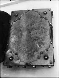| Keywords: Iron-bound wooden covered book at Mission Santa Clara, ca.1908 (CHS-4459).jpg en <br> Iron-bound wooden covered book at Mission Santa Clara ca 1908 Photograph close-up of an iron-bound wooden covered book at Mission Santa Clara ca 1908 The wooden cover has four identical metal pieces on each corner There are several studs and a metal starburst-shaped stud in the middle of each piece Two hinges at the left hold the wooden cover to the rest of the book There is no writing on the cover of the book Call number CHS-4459 Legacy record ID chs-m16809; USC-1-1-1-14096 Photographer James George Wharton Filename CHS-4459 Coverage date circa 1908 Part of collection California Historical Society Collection 1860-1960 Type images Geographic subject city or populated place Santa Clara Repository name USC Libraries Special Collections Accession number 4459 Microfiche number 1-144-7; 1-145-7 Archival file chs_Volume96/CHS-4459 tiff Repository address Doheny Memorial Library Los Angeles CA 90089-0189 Geographic subject country USA Format aacr2 3 photographs glass photonegative photoprints b w ; 22 x 17 cm Rights Digitally reproduced by the USC Digital Library; From the California Historical Society Collection at the University of Southern California Subject adlf religious facilities Project USC Repository email specol usc edu Identifying number unidentified no James-128 Contributing entity California Historical Society Date created circa 1908 Publisher of the digital version University of Southern California Libraries Format aat photographic prints; photographs Geographic subject state California Subject file heading Mission Santa Clara de Asis Format glass plate negatives Access conditions Send requests to address or e-mail given Phone 213 821-2366; fax 213 740-2343 Geographic subject county Santa Clara Subject lcsh Missions Spanish Subject Santa Clara de Asis Mission; Mission Santa Clara; Mission Santa Clara -- Furnishings; Mission furnishings circa 1908 date created James George Wharton http //digitallibrary usc edu/cdm/ref/collection/p15799coll65/id/16742 PD-old-70-1923 Images from USC Digital Library uploaded by Fæ California Historical Society Collection 1860-1960 Glass plate negatives Mission Santa Clara de Asís Photographs by George Wharton James |
