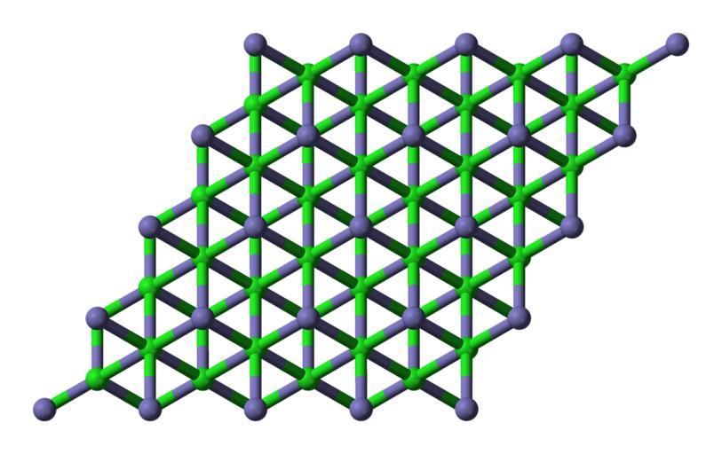 | Keywords: Iron(II)-chloride-xtal-3D-balls-C.png Ball-and-stick model of part of the crystal structure of iron II chloride FeCl<sub>2</sub> X-ray crystallographic data from http //rruff geo arizona edu/AMS/download php id 10773 cif down text AMCSD originally from <small>R W G Wyckoff Crystal Structures 1 1963 Second edition Interscience Publishers New York 239-444 </small> Own 2009-03-05 Ben Mills Benjah-bmm27 Images by Ben Mills Crystal structure of iron II chloride | ||||