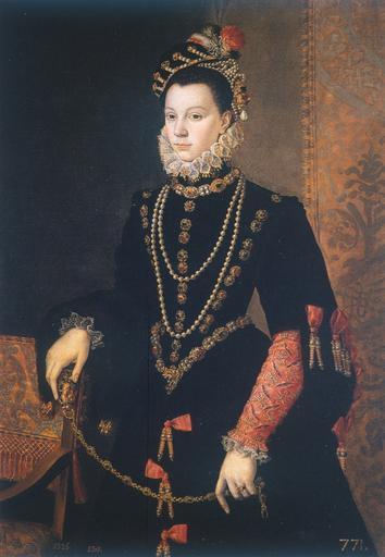 | Keywords: Isabel de Valois1.jpg artwork Creator Juan Pantoja de la Cruz Elizabeth of Valois third wife of Philip II La reina langswitch Isabel de Valois was the daughter of King Henri II of France and Catharine of Medici Born in 1546 she married Felipe II in 1559 helping to consolidate the peace process between Spain and France She was probably the Spanish Monarch's closest wife and she played a political role during her reign She was the mother of the infantas Isabel Clara Eugenia and Catalina Micaela whose weddings were planned to strengthen the Spanish presence in Flanders and Savoy The Queen wears an austere black velvet dress in keeping with Spanish fashion at that time but she is adorned with sumptuous jewels Her right arm rests on a court armchair and in her hands she holds a zibellini with an elegant gold chain ending in a gold pendent in the form around an animal head set with precious stones The movement of this jewel along with the use of red in the ribbons and sleeves gives this portrait a certain variation and dynamism which Pantoja uses to distance his style from the stasis and rigidity that predominated in earlier Spanish portraiture Still he follows the guidelines set out during Felipe II's time using the model's cold and impassive expression to emphasize the solemnity of the royal image Some specialists consider this work to be a copy of an original by the painter Sofonisba Anguissola a protégée of the Queen It was painted for the Royal Collection and entered the Prado Museum from there Hija del rey Enrique II de Francia y de Catalina de Medici Isabel nació en 1546 y contrajo matrimonio con Felipe II en 1559 este hecho formó parte de la consolidación del proceso de paz entre España y Francia Probablemente fue la esposa más cercana al Monarca español y durante su reinado disfrutó de cierto protagonismo político Fue madre de las infantas Isabel Clara Eugenia y Catalina Micaela cuyas bodas fueron planeadas para potenciar la presencia española en Flandes y Saboya La Reina está vestida con un austero traje de terciopelo negro siguiendo la moda española de la época aunque se adorna con ricas joyas Apoya su brazo derecho en un sillón cortesano mientras sostiene con ambas manos una elegante cadena de oro rematada por una rica pieza de este metal y piedras preciosas con forma de cabeza de animal El movimiento de esta joya junto con la incorporación de los tonos rojos de lazos y mangas otorgan al retrato una cierta variación y dinamismo cualidades que Pantoja utiliza para alejar su estilo del estatismo y rigidez imperantes en la retratística española anterior Sin embargo sigue las directrices definidas en tiempos de Felipe II acentuando la solemnidad de la imagen regia mediante el gesto frío e impasible del personaje Esta obra considerada por algunos especialistas como copia de un original de la pintora Sofonisba Anguissola artista protegida por la Reina pertenece desde su ejecución a la Colección Real de donde pasó al Museo del Prado 1605 Oil on canvas cm 120 1 84 Institution Prado object history credit line accession number P01030 Unknown see http //www museodelprado es/coleccion/galeria-on-line/galeria-on-line/zoom/2/obra/la-reina-isabel-de-valois-tercera-esposa-de-felipe-ii/oimg/0/ this link for another version of this image This image is in the public domain due to its age <gallery>Isabel de Valois2 jpg</gallery> PD-old-100 Original upload log page de wikipedia Elisabeth_von_Valois_Farbe jpg 2005-10-01 15 25 Caro1409 967×1400× 341223 bytes <nowiki></nowiki> DEFAULTSORT 1605; Elisabeth of Valois by Pantoja de la Cruz Isabel de Valois por Juan Pantoja de la Cruz Museo del Prado |