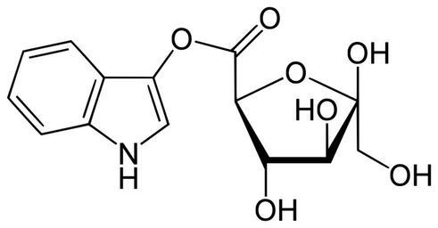 Keywords: Isatan B.svg en Isatan B indigo precursor from leaves of Isatis tinctoria de Isatan B Indigovorläufer im Färberwaid Isatis tinctoria ; Indoxyl-5-ketogluconat own Yikrazuul 2010-07-17 Indigo dye Glycosides