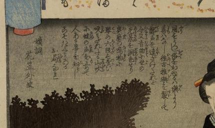 | Keywords: Iseya Ichibei - Genjigumo ukiyo-e awase - Walters 95110 - Detail A.jpg The evil lady-in-waiting Iwafuji plots to kill the shogun in the play Kagamiyama kokyo no nishikie The Women's Chushingura This chapter of The Tale of Genji also concerns ladies-in-waiting and divided loyalties at the court 1845-46 late Edo pigments mulberry paper cm 36 8 25 5 accession number 95 110 2912 Justine Lewis Keidel date and mode of acquisition unknown Walters Art Museum Gift of Justine Lewis Keidel 1986 Signature Chooro Kuniyoshi ga; Transcription Genban Ise-shi; Translation First published Ise city place of origin Edo present-day Tokyo Japan Walters Art Museum license 2D Japanese prints in the Walters Art Museum Historic samurai prints Media contributed by the Walters Art Museum needs category review Utagawa Kuniyoshi |