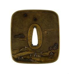| Keywords: Ishiguro Masatsune II - Tsuba with Lovers Behind Sliding Doors - Walters 51399 - Back.jpg This tsuba depicts the scene in a garden immediately outside a home At the right is a building with a veranda and rice paper doors At the left a water basin sits on a stump before a reed fence Behind the fence a cherry tree is shown in bloom In the foreground at the bottom are the rock and step leading to the house The doors are moveable When opened they reveal a scene of two lovers inside the house Along the bottom of the reverse is a stream with a bridge and birds 1830 late Edo iron sentoku gold shakudo silver copper and gold alloy cm 8 3 accession number 51 399 35493 Henry Walters Baltimore date and mode of acquisition unknown Walters Art Museum Henry Walters Acquired by Henry Walters Date Tenpô gen tsuchi-no-e tora chûshun; Translation second month in the first year of Tenpo 1830 the year of the tiger; Signature Ishiguro Masatsune place of origin Edo present-day Tokyo Japan Walters Art Museum license Tsuba in the Walters Art Museum Ishiguro Masatsune II Media contributed by the Walters Art Museum needs category review |