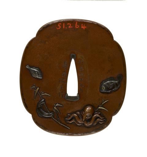 | Keywords: Ishiguro Masayoshi I - Tsuba with Fish - Walters 51264 - Back.jpg Nine different forms of fish and sea creatures are illustrated on this tsuba All are regularly consumed as part of the Japanese diet On the front a spiny lobster is at the lower right Proceeding around in a clockwise direction are a flounder a puffer fish a second flounder and a sea bream On the reverse are a snapper an octopus an eel and a flounder 1843 Edo copper silver gold mother-of-pearl shakudo shibuichi cm 8 4 7 69 0 48 accession number 51 264 24729 Henry Walters Baltimore date and mode of acquisition unknown Walters Art Museum Henry Walters Acquired by Henry Walters Date Konen roku ju kyusai/Juo Masayoshi; Signature Konen roku ju kyusai/Juo Masayoshi; Translation 69 years old/Juo Masayoshi place of origin Edo present-day Tokyo Japan Walters Art Museum license Tsuba in the Walters Art Museum Ishiguro Masayoshi I Media contributed by the Walters Art Museum needs category review |