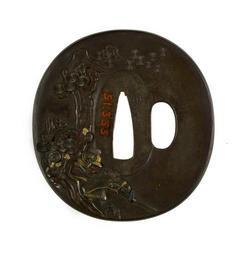 | Keywords: Ishikawa Hirosada - Tsuba with Ch么un Rescuing Gentoku's Infant - Walters 51355 - Back.jpg Ch魎n Ch Zhao Yun Chao Yun was a 3rd-century warrior fighting in support of the Chinese emperor Gentoku Ch Liu Bei Liu Pei At the battle of Changfan Kiao the emperor had to flee leaving behind his wife and infant son Ch魎n rescued the son While fleeing with the boy he had to leap with his horse across a great chasm On the tsuba Ch魎n is depicted on the right leaping over the chasm The infant's head is barely visible near the horse's mane On the reverse another warrior is shown riding past a tree This may be one of Ch魎n's pursuers 1st half Other date century 19 late Edo shibuichi gold and copper details cm 7 3 accession number 51 355 17534 Henry Walters Baltimore date and mode of acquisition unknown Walters Art Museum Henry Walters Acquired by Henry Walters Signature Kitsuru Hirosada kao ; Signature Shugensai place of origin Edo present-day Tokyo Japan Walters Art Museum license Tosogu Japanese sword fittings in the Walters Art Museum Media contributed by the Walters Art Museum needs category review Ishikawa Hirosada |