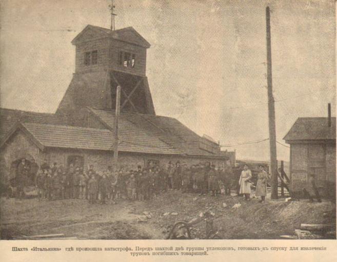 | Keywords: Iskri 12 - 4,3.jpg Фотог афия из иллюст и ованного художественно-лите ату ного и юмо истического жу нала с ка икату ами «Иск ы» 12 Воск есенье 18 ма та 1912 г Катаст офа в акеевке Шахта «Итальянка» где п оизошла катаст офа Пе ед шахтой две г уппы углекопов готовых к спуску для извлечения т упов погибших това ищей http //www odin-fakt ru/iskry/_12_jurnala_iskry_god1912/ Iskri 12 - 4 jpg 1 ма та 1912 Фот В Ф овикова PD-RusEmpire Iskri 1912 12 Italianka coal mine 1912 in Makeevka Photographs uploaded by Andrew Butko from various sources less 1000 px on long side |