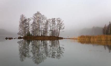 Keywords: island lake beach landscape water trees tree scenic fog autumn calm reflection