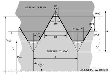 | Keywords: ISO and UTS Thread Dimensions.svg A diagram of an ISO metric or Unified thread showing dimensions relative to the pitch P and thread height H Note that while diferent standards ISO and UTS share the same geometry but not absolute dimensions Also shown is the location rounding permissible in internal dark grey top and external light grey bottom threads Key P Pitch H Thread height D<sub>maj</sub> Major diameter D<sub>min</sub> Minor diameter D<sub>p</sub> Effective pitch diameter Do not scale from this drawing Self-made Inkscape 2008-01-16 Inductiveload ISO and UTS Thread Dimensions bg svg Drawings of threads ISO metric screw thread |