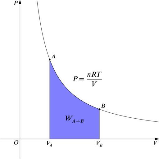 | Keywords: Isothermal process.svg en Illustration of isothermal process 2011-06-20 own Netheril96 Created by Asymptote and converted by Inkscape Source file <pre> size 300 ; settings tex xelatex ; usepackage amsmath unicode-math ; texpreamble \setmathfont XITS Math ; import graph; xaxis V -50 450 Arrow ; yaxis P -50 350 Arrow ; label O 0 0 SW ; real f real x return 15000/x; ; guide g graph f f 350 350 operator ; label scale 1 2 Label P \dfrac T V g align 2 2 ; draw g ; pair A f 200 200 ;pair B 200 f 200 ; pair C 200 0 ;pair D f 200 0 ; filldraw graph f f 200 200 operator --C--D--cycle lightblue ; dot A ;dot B ; label A A NE ;label B B NE ; label V_B C S ;label V_A D S ; label scale 1 2 Label W_ A\to B 200+f 200 /2 50 ; </pre> cc-zero Uploaded with UploadWizard Isothermal process |