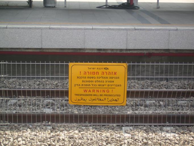 Keywords: IsraelRailWarning.jpg en A standard Israeli trilingual sign warning against crossing the railway The translation into Arabic is partial he ש ט אזהרה סטנדרטי ת ת שוני המזהיר מפני חציית פסי הרכבת התרגו ערבית ח קי ar تحذير نمطي إسرائيلي بثلاث لغات يشير إلى حظر اجتياز السكة الحديدية الترجمة إلى العربية جزئية Own Drork 2008-08-14 18 14 17 Multilingual warning signs in Israel |