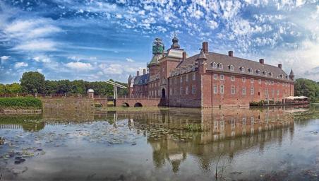 Keywords: isselburg germany sky clouds anholt landmark pond moat water reflections castle palace building bridge architecture outside