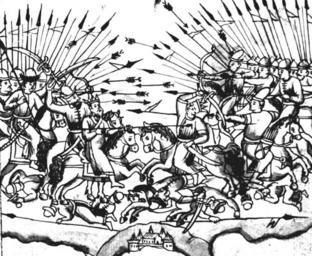 | Keywords: IstSib018 1.jpg Битва ца я Кучума с войском Етиге а и Бекбулата Исто ия Сиби ская ультимедиа Цент ГУ http //www mmedia nsu ru/vbook/vbook/obj8/MINIATURES htm 1697 - 1703 С У Ремезов Author died more than 70 years ago - public domain PD-old Remezov Chronicle |