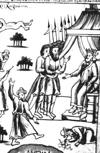 | Keywords: IstSib022 2.jpg Ца ь Кучум ассп ашивает волхвов и усских пленников о видении Исто ия Сиби ская ультимедиа Цент ГУ http //www mmedia nsu ru/vbook/vbook/obj8/MINIATURES htm 1697 - 1703 С У Ремезов Author died more than 70 years ago - public domain PD-old Remezov Chronicle |