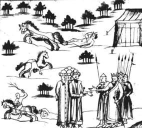 Keywords: IstSib024 1.jpg Ца ь Кучум своих волхвов повеле по лугу конми азвлачити Исто ия Сиби ская ультимедиа Цент ГУ http //www mmedia nsu ru/vbook/vbook/obj8/MINIATURES htm 1697 - 1703 С У Ремезов Author died more than 70 years ago - public domain PD-old Remezov Chronicle |