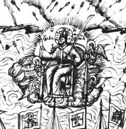 | Keywords: IstSib042 1.jpg Явление и заступничество Вседе жателя п и нападении тата на казачьи ст уги Исто ия Сиби ская ультимедиа Цент ГУ http //www mmedia nsu ru/vbook/vbook/obj8/MINIATURES htm 1697 - 1703 С У Ремезов Author died more than 70 years ago - public domain PD-old Remezov Chronicle |