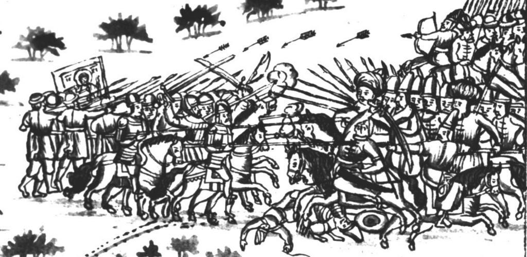 | Keywords: IstSib065 1.jpg Битва казаков с от ядом аметкула в у очище Шаншинском Исто ия Сиби ская ультимедиа Цент ГУ http //www mmedia nsu ru/vbook/vbook/obj8/MINIATURES htm 1697 - 1703 С У Ремезов Author died more than 70 years ago - public domain PD-old Remezov Chronicle |