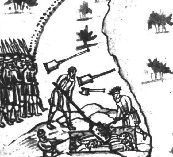 | Keywords: IstSib065 2.jpg Похо оны погибших казаков на ца ском кладбище на Саусканском мысу Исто ия Сиби ская ультимедиа Цент ГУ http //www mmedia nsu ru/vbook/vbook/obj8/MINIATURES htm 1697 - 1703 С У Ремезов Author died more than 70 years ago - public domain PD-old Remezov Chronicle |