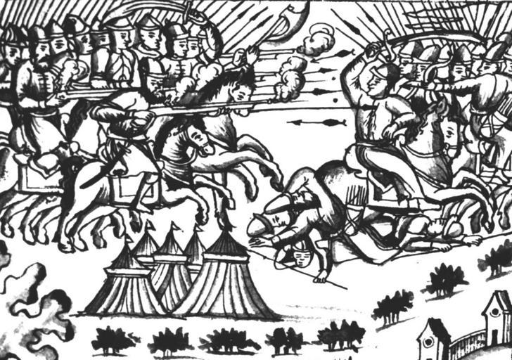 | Keywords: IstSib105 1.jpg Поход тобольского воеводы В В асальского-Кольцова п отив Кучума Исто ия Сиби ская ультимедиа Цент ГУ http //www mmedia nsu ru/vbook/vbook/obj8/MINIATURES htm 1697 - 1703 С У Ремезов Author died more than 70 years ago - public domain PD-old Remezov Chronicle |