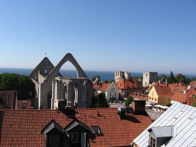 Keywords: ISVyS-tKarin.JPG en View of the ruins of St Catherine church at Main square Visby Gotland Sweden In the foreground Ryska Gränd 1 tile roof and 2A tin roof right 57 63992 18 29693 region SE_heading NW Saint Catherine in Visby Churches in Sweden photographed in 2006 Ryska gränd |