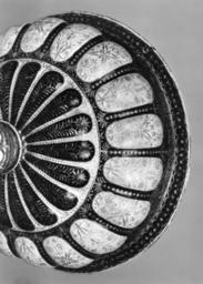 | Keywords: Italian - Bowl - Walters 44203 - Detail A.jpg The upper part of the bowl is embossed in relief with eighteen flutes decorated with floral scrolls in gilding on a white ground The rim and the intervals between the flutes are blue with floral ornaments in gilding The bottom of the bowl is of a white ground embossed with eighteen gadroons alternately blue and green tapering towards the center with their arched tops spaced between the separations of the flutes above them The gilt ornaments are the same as on the upper part At the inner center of the bowl is an applied medallion of enamel remade by André in Paris at the end of the 19th century with the arms of the Mocenigo family gules a chevron azure between three quatrefoils azure The vasiform stem is blue with eight white flutes in relief on the lower curve The foot consists of a bell-shaped upper part green with floral and other ornaments in gilding and of a depressed base blue decorated with a gilt scroll between two bands of running foliage It is held in a copper-gilt rim The inside of the foot is blue late Other date century 15 technique painted enamel copper cm 27 32 accession number 44 203 38864 Emile Gavet date and mode of acquisition unknown Sale Paris May 31 1897 no 719 J Egger date and mode of acquisition unknown Jacques Seligmann Paris November 3 1905 by purchase Henry Walters city Baltimore Walters Art Museum Henry Walters Acquired by Henry Walters 1906 25th Anniversary Exhibition of European Masterpieces The Washington County Museum Hagerstown 1956 Three Great Centuries of Venetian Glass Corning Museum of Glass Corning 1958 place of origin Venice Italy Walters Art Museum license Gadrooning Renaissance applied arts in the Walters Art Museum Italian art in the Walters Art Museum Media contributed by the Walters Art Museum needs category review Painted enamel art in the Walters Art Museum |