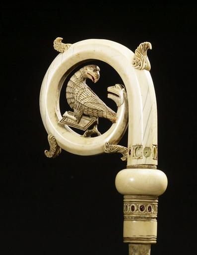 Keywords: Italian - Crozier Head with the Eagle of Saint John - Walters 71300 - View E.jpg This crosier possibly made in Sicily in the thirteenth century is made of ivory with a depiction of an eagle set inside the crook The curve of the crook is marked with small leaves or tendrils reminiscent of the swirling vines that form the shapes of illuminated initials in some manuscripts from this period The sprouting curve ends in the head of a dragon with his mouth open and ears flattened against his head and perched within this scroll is an eagle the symbol of John the Evangelist The eagle holds a book inscribed with abbreviated forms of the Latin words for John and Evangelist confirming that this is no ordinary bird but a symbol of the Gospel author The eagle turns his head to confront the dragon eye to eye - a depiction of the power of the Word of God to conquer evil The piece is inset with colored glass and there is evidence that parts of it were once set off with gold and paint century 13 Medieval ivory with polychrome and glass inlay cm 19 6 12 1 4 5 accession number 71 300 24336 Henri Daguerre Paris by purchase Henry Walters Baltimore date and mode of acquisition unknown Walters Art Museum Henry Walters Acquired by Henry Walters An Exhibition of the Treasures of The Walters Art Gallery The Walters Art Museum Baltimore; Pace Wildenstein Gallery New York; Smith College Museum of Art Northampton 1967 Ivory The Sumptuous Art The Walters Art Gallery Baltimore 1983-1984 Illuminated Manuscripts Masterpieces in Miniature The Walters Art Gallery Baltimore 1984-1985 Highlights from the Collection The Walters Art Gallery Baltimore 1998-2001 place of origin Sicily Italy Walters Art Museum license Medieval ivory in the Walters Art Museum Italian art in the Walters Art Museum Ivory croziers Media contributed by the Walters Art Museum needs category review |