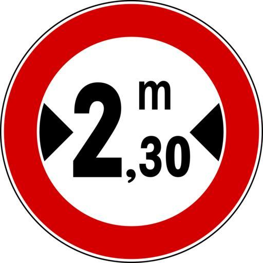 | Keywords: Italian traffic signs - divieto di transito larghezza 2,30m.svg transito vietato ai veicoli aventi larghezza superiore a 2 30 m maximum width allowed 2 30 m Own 8/11/2006 F l a n k e r <gallery> File Italian traffic signs - limitazione di larghezza early svg First post-war version File Italian traffic signs - old - divieto di transito ai veicoli con larghezza superiore a svg 1959-1992 version </gallery> Diagrams of regulatory road signs of Italy SVG road signs in Italy Limited width prohibitory road signs |