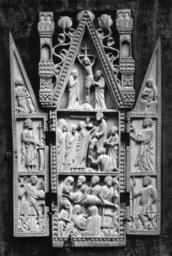 | Keywords: Italian - Triptych with the Passion of Christ and Saints - Walters 71101.jpg The central panel is carved with the Crucifixion at the top in the gable and the Deposition and Entombment below An unusual detail in the Entombment is the rectangular wooden coffin prepared for the body of Christ In the wings the angel of the Annunciation and the Virgin appear in the gables Saint John the Baptist and Saint Michael stand below on the left and Saint John the Evangelist and Saint George on the right The borders are pearled; those on the cetnral panel have a drilled dot in each pearl The center gable decorated with branches of pomegranate caped with the fruit is flanked by two towers The unusual treatment of the central panel with towers and pomegranates has led scholars to attribute the triptych to Portugal or various colonies The model for the triptych however is a Venetian ivory in the Victoria and Albert Museum The wings of the Walters piece including the pearled borders are copied exactly from the London example The main panel is different as is the gable which in London lacks the pomegranates However the gable of the Victoria and Albert example was originally flanked by towers of a similar nature which have been cut off The question arises whether the bone example is a copy made in another location or a cheaper product from the same Venetian workshop It is noteworthy for its Byzantinizing style especially the figures of Saint George and Saint Michael The triptych considerably rubbed has a small break at the base of the central panel and four cuts for earlier hinges The present pin hinges are replacements late Other date century 14 Medieval bone cm 24 7 14 6 accession number 71 101 14718 Said by the vendor to have come from a Portuguese convent Henri Daguerre Paris date and mode of acquisition unknown Henry Walters city Baltimore Walters Art Museum Henry Walters Acquired by Henry Walters 1925 place of origin Venice Italy Walters Art Museum license Medieval ivory in the Walters Art Museum Italian art in the Walters Art Museum Media contributed by the Walters Art Museum needs category review |