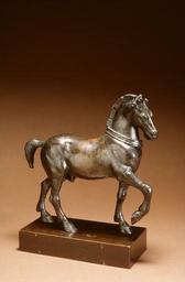 | Keywords: Italian - Walking Horse "after Lysippus" - Walters 5450.jpg This graceful elegant creature is a small-scale copy of one of the four life-size walking horses on the facade of the Basilica of St Mark in Venice In the Renaissance they were thought to have been cast by the great Greek sculptor Lysippus and therefore reduced copies were in great demand The life-size horses were originally from a quadriga four-horse chariot of a type installed atop a triumphal arch in ancient Rome In the 4th century Emperor Constantine took the horses to his new capital Constantinople present-day Istanbul Turkey In the 1200s they were stolen by Crusaders who brought them to Venice century 16 Renaissance bronze traces of gilding on harness and mane cm 23 5 24 1 accession number 54 50 6844 Henry Walters Baltimore 1922-1930 mode of acquisition unknown Walters Art Museum Henry Walters Acquired by Henry Walters 1922-1930 World of Wonder The Walters Art Gallery Baltimore 1971-1972 The Allure of Bronze The Walters Art Gallery Baltimore 1995 place of origin Padua Italy Walters Art Museum license Renaissance sculpture in the Walters Art Museum Ancient Greek sculptures in the Walters Art Museum Italian art in the Walters Art Museum Media contributed by the Walters Art Museum needs artist review Gilding bronze sculptures |