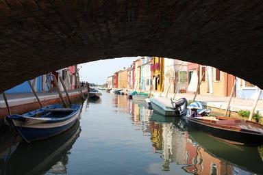 Keywords: italy burano island venice colorful houses channel colors boats colored water postcards reflections