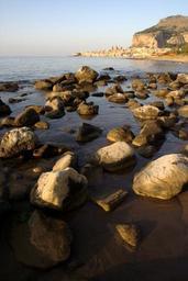 Keywords: italy sicily cefalù sea water beach bank rock rocky coast summer coast stones hill mountain