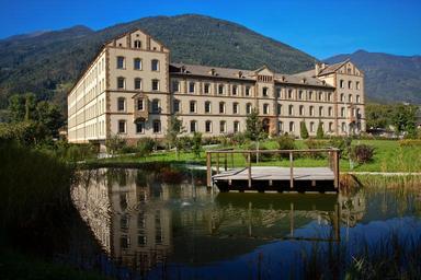 Keywords: italy vinzentinum hotel resort building structure mountain forest trees woods lake pond water reflections grass plants scenic summer spring nature outside