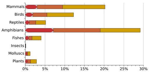 | Keywords: IUCN Red List 2007.svg validSVG Percentage of species listed on the IUCN Red List by group IUCN_Red_List_2007 png 2010-01-27 00 27 UTC Vectorization by B Jankuloski <span class signature-talk >talk</span> Original IUCN_Red_List_2007 png H2g2bob IUCN Red List 2007 mk svg IUCN Red List 2007 IT svg IUCN Red List 2007 BN svg IUCN Red List 2007 as svg IUCN_Red_List_2007-sl png Key Colors match Image Status iucn3 1 svg <span style background CD3031 > </span> Critical <span style background CD6531 > </span> Endangered <span style background D59D00 > </span> Vulnerable Data Data retrieved from http //www iucnredlist org/info/stats IUCN Red List on 17 32 14 February 2009 UTC Total number of species from http //www iucnredlist org/documents/2008RL_stats_table_1_v1223294385 pdf Table 1 Number of species in VU EN and CR from http //www iucnredlist org/documents/2008RL_stats_table_2_v1223294385 pdf Table 2 Not all species from the total number of species column are assessed by IUCN so these percentages refer to the minimum proportion of species which qualify for listing See source documents for details wikitable 2007 wikitable align left valign top Group Species Threatened CR EN VU - Mammals 5416 1094 163 349 582 - Birds 9956 1217 189 356 672 - Reptiles 8240 422 79 139 204 - Amphibians 6199 1808 441 737 630 - Fish 30000 1201 254 254 693 - Insects 950000 623 69 129 425 - Mollusc 81000 978 268 224 486 - Plants 297326 8447 1569 2278 4600 wikitable 2008 wikitable Group Species Threatened CR EN VU - Mammals 5488 1141 188 448 505 - Birds 9990 1222 190 361 671 - Reptiles 8734 423 86 134 203 - Amphibians 6347 1905 475 755 675 - Fish 30700 1275 289 269 717 - Insects 950000 626 70 132 424 - Mollusc 81000 978 268 224 486 - Plants 298506 8457 1575 2280 4602 Vector version made SVG Bjankuloski06en IUCN_Red_List_2007 png Data Data from </nowiki> Uploaded with derivativeFX Endangered species SVG biology Conservation status diagrams |